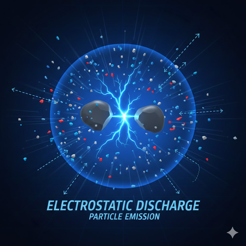 정전기가 위험한 두 번째 이유는 ‘방전’ 과정에서 발생하는 순간적인 에너지로 인해 미세한 입자가 새롭게 생성된다는 점이다. 방전(ESD)은 전자가 급격하게 이동하며 주변 표면을 들떠 떨어뜨리고, 이때 미세 섬유, 금속 산화 입자, 탄화 잔여물 등이 떨어져 나가 오염원이 된다.